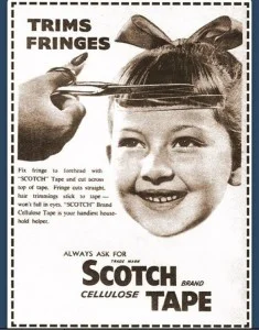 This is actually an old Scotch Tape ad! It recommends using Scotch Tape to cut bangs. The added bonus, the cut hair sticks to the tape to prevent any mess. Hmmmm
